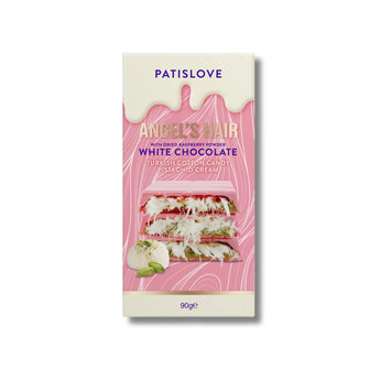 Angel’s Hair White Chocolate with Dried Raspberry Powder is a luxurious fusion of creamy white chocolate, zesty raspberry, and Mediterranean indulgence. Delicate Turkish cotton candy and smooth pistachio cream form the heart of this unique bar, while a sprinkle of dried raspberry powder adds a tangy twist. The result is a multi-textured experience—airy, creamy, nutty, and fruity in perfect balance. Crafted for those who crave bold flavor and elegant presentation, this 90g bar delivers true artisan indulgence in every bite.