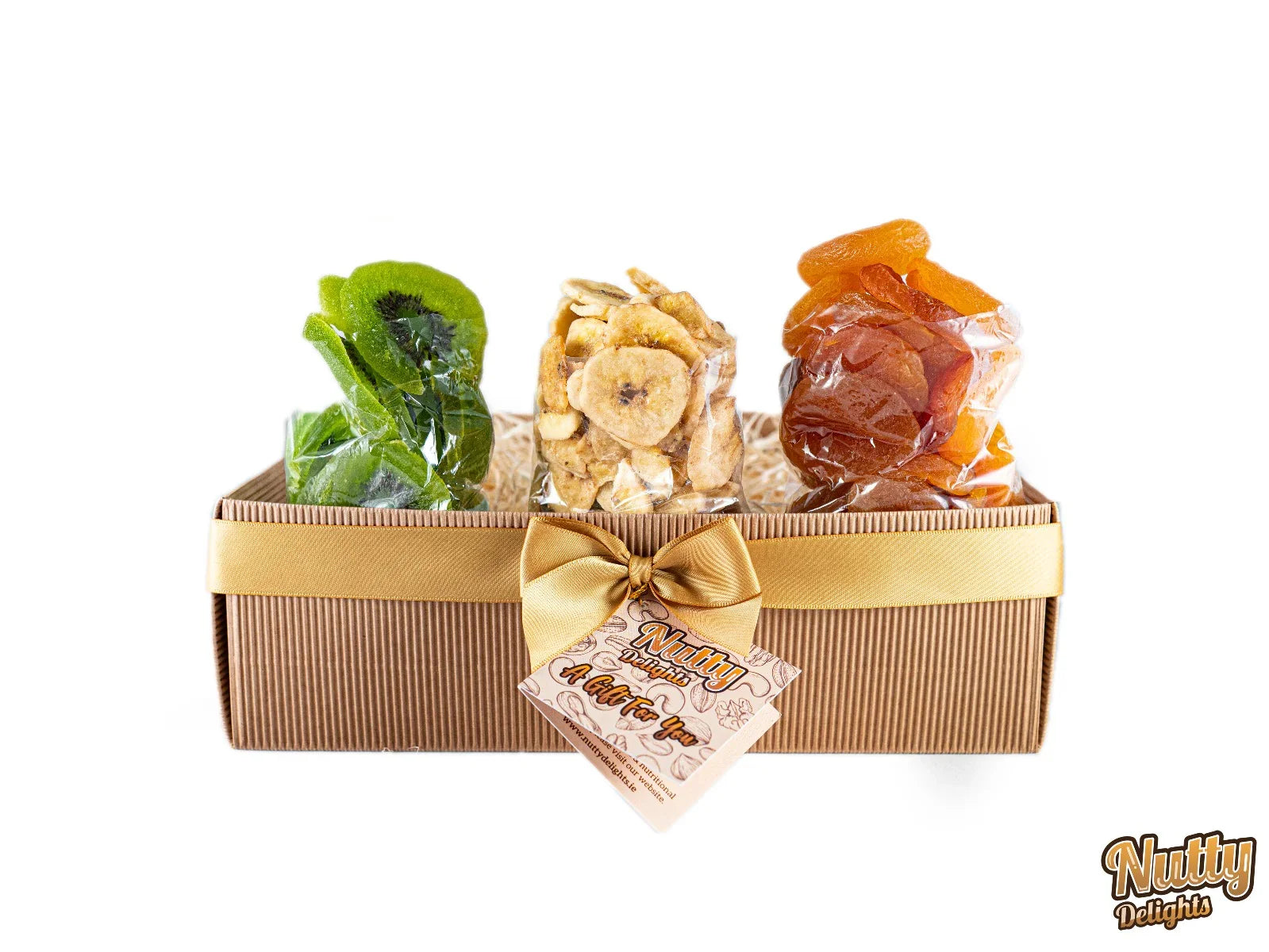 Fruit: Dried Kiwi, Banana, and dried apricots.