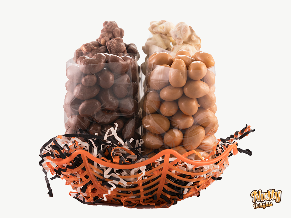 Trick-or-treating always comes with sweets, and that's why we offer you a basket of chocolate-covered nuts and clusters for everyone to enjoy. It is still chocolate that everyone likes, but at the same time, it is an alternative to the typical Halloween sweets, as these clusters and nuts are crunchier and have a more natural and less artificial flavour, with that touch of dried fruit so typical of autumn. If you are vegan or lactose intolerant, DON'T WORRY! You can personalise the basket with dark chocolate covered nuts, which are dairy-free.
