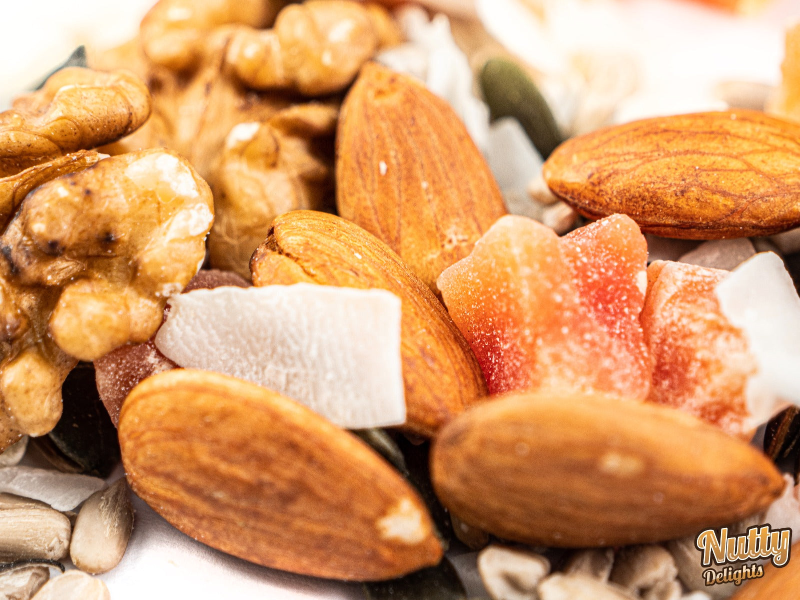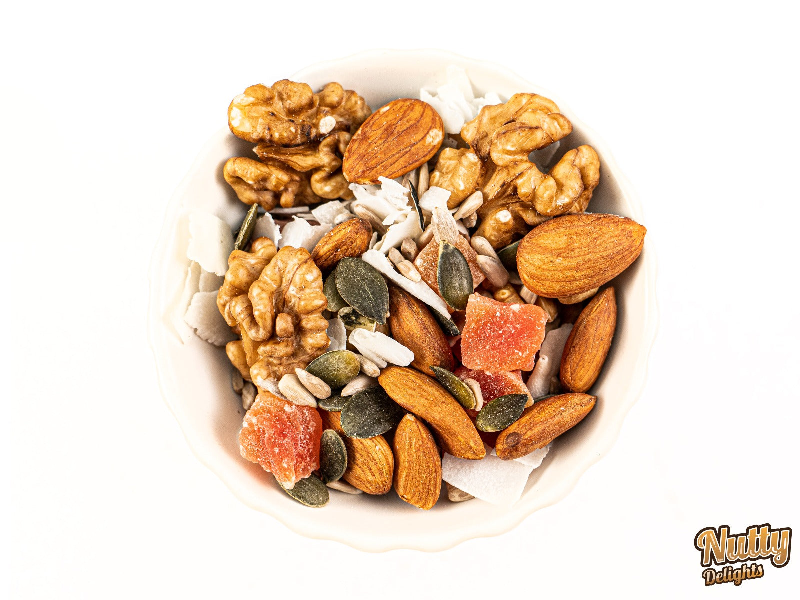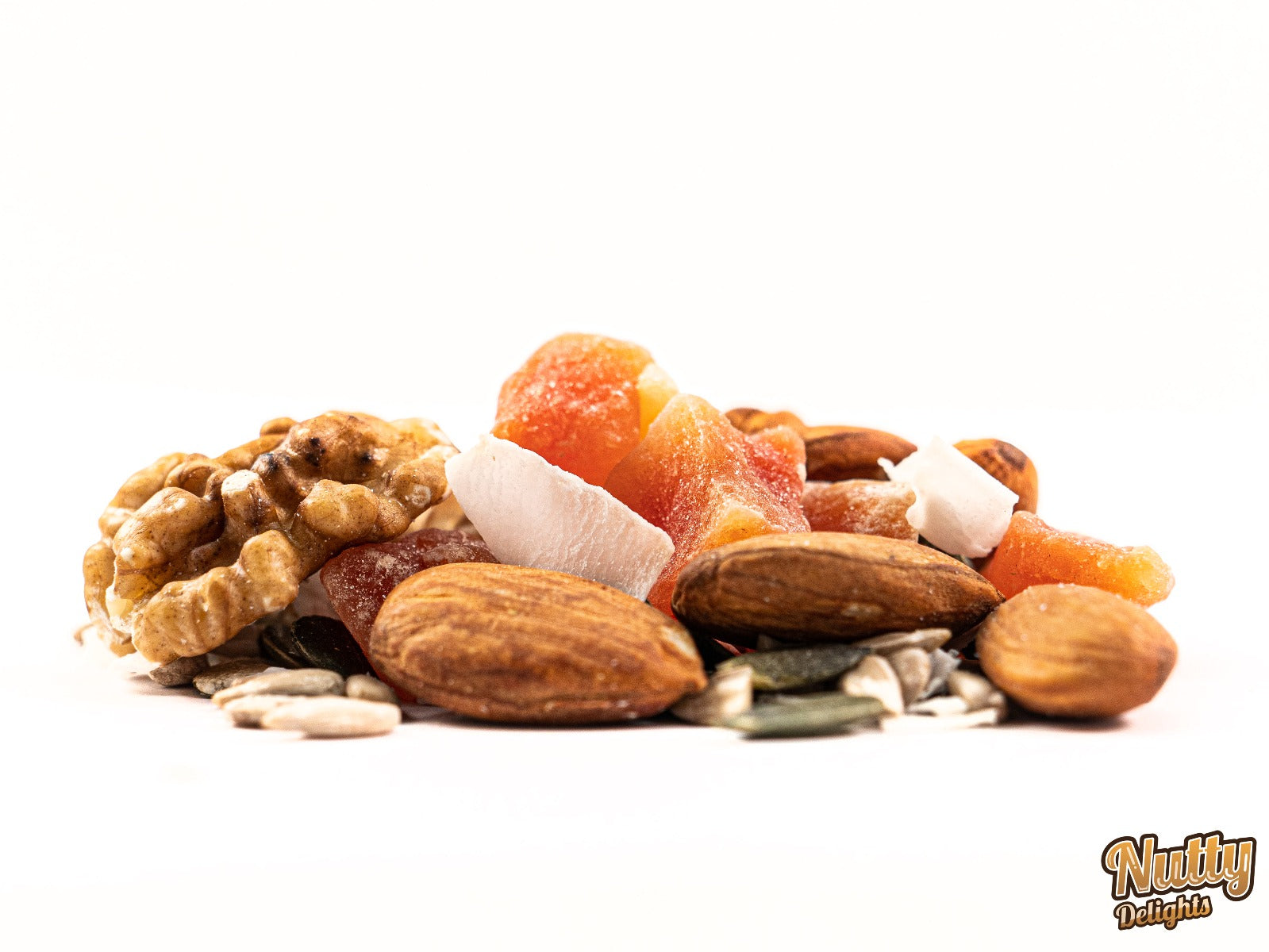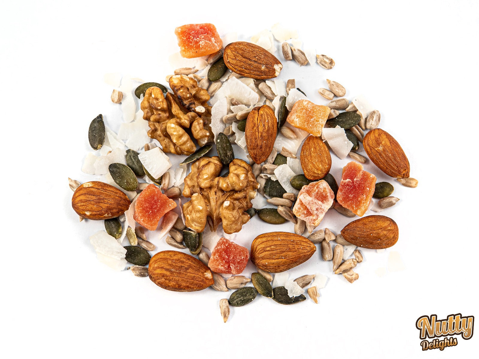 Whole ALMONDS, WALNUT halves, coconut chips (coconut, SODIUM METABISULPHITE (E223)), papaya (papaya, cane sugar, SUPLHATE (E220 or E223)), pumpkin seeds, sunflower seeds.