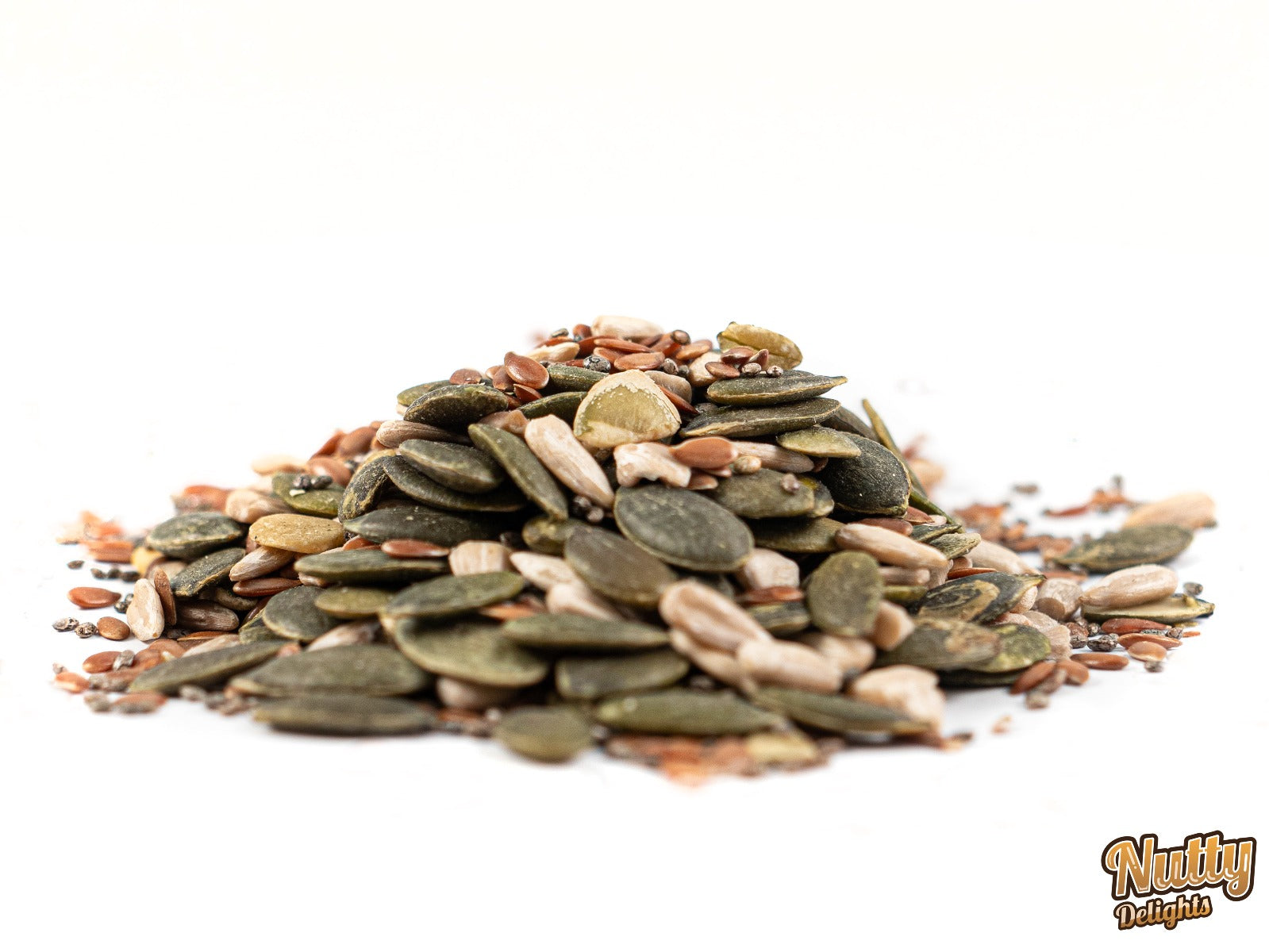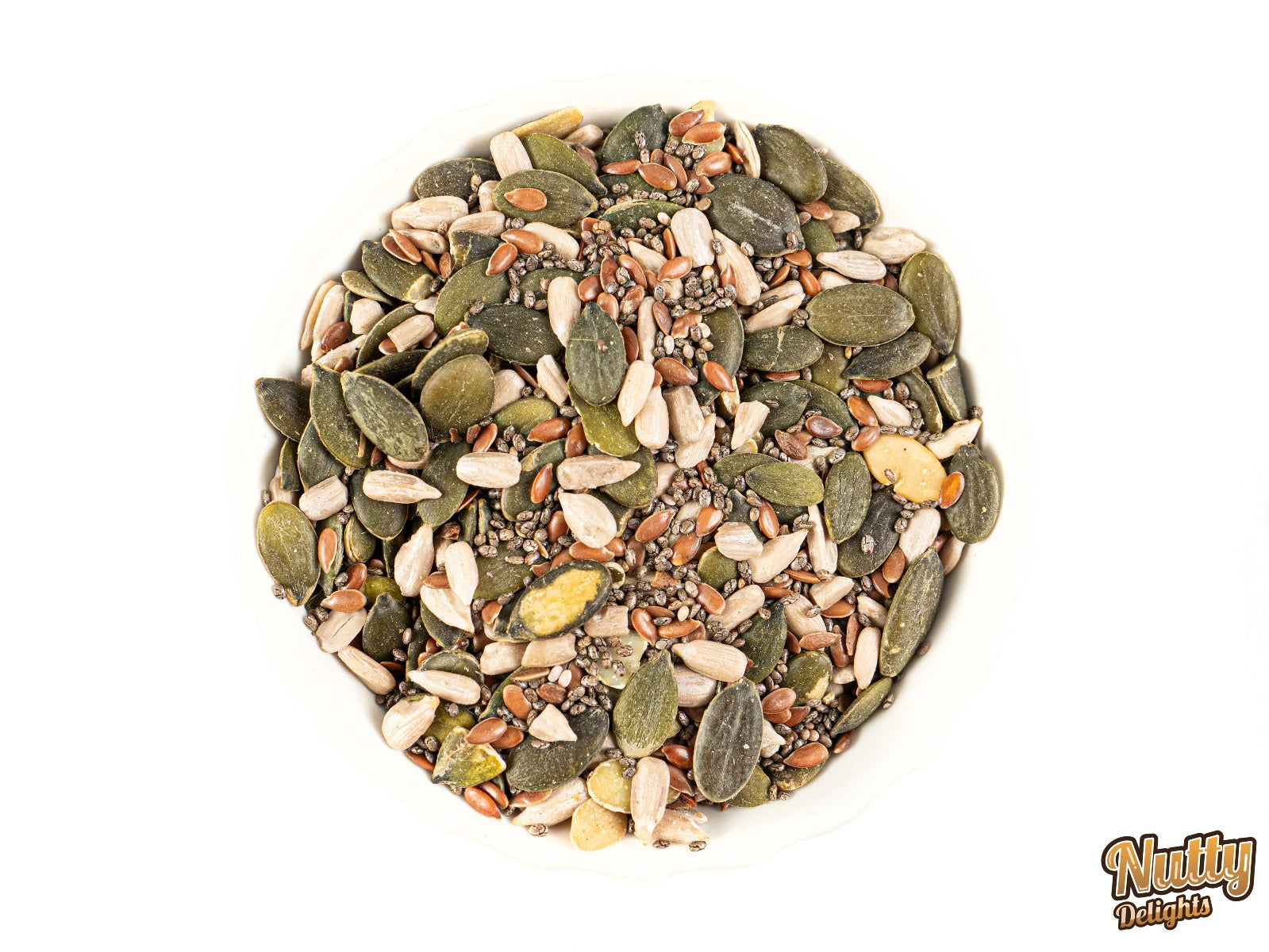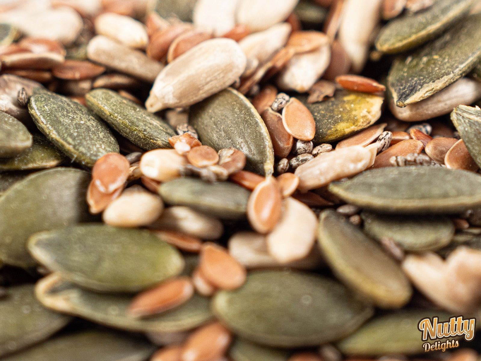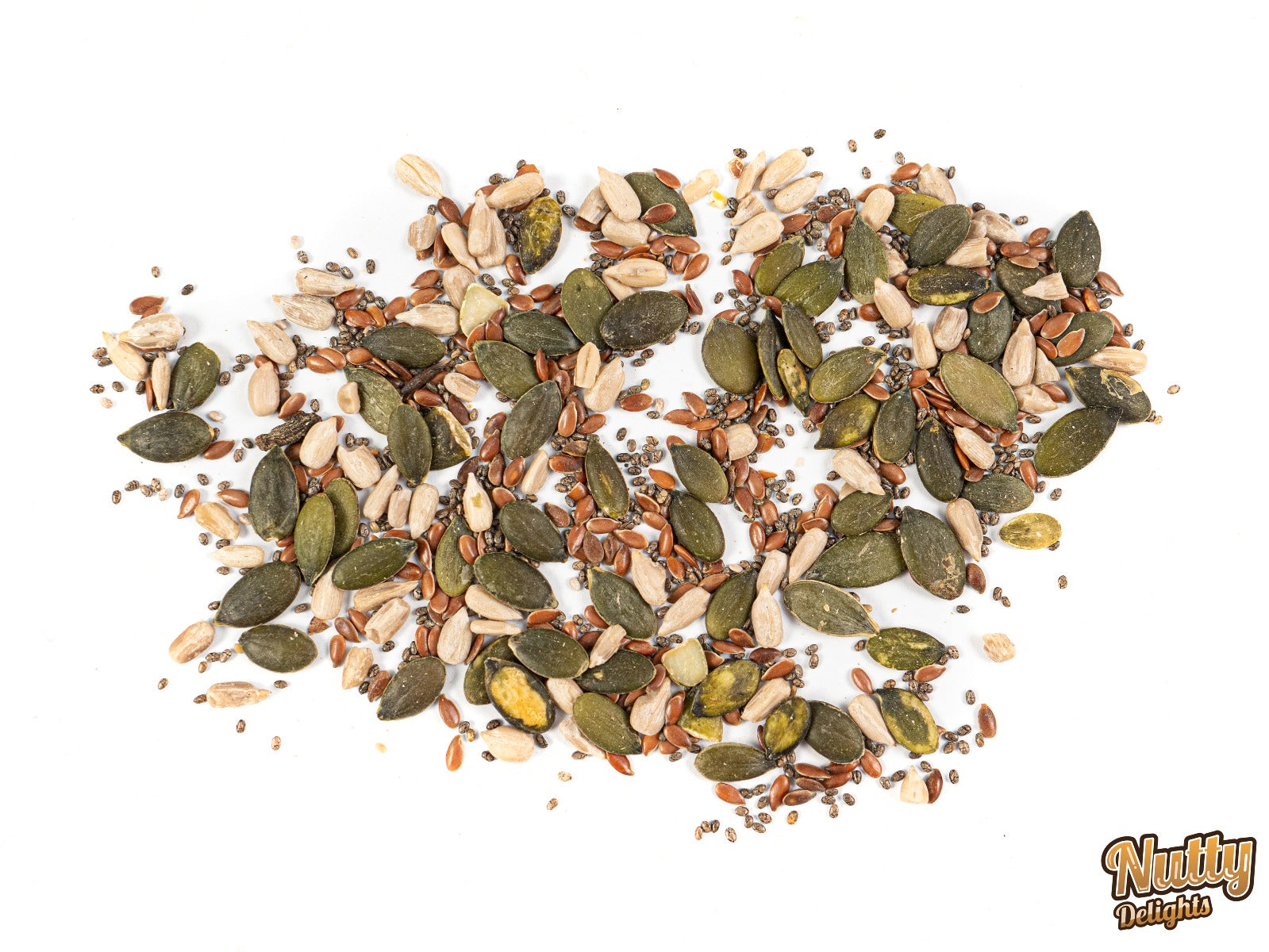 Chia Seeds, Sunflower Seeds, Pumpkin Seeds, Flax Seeds.