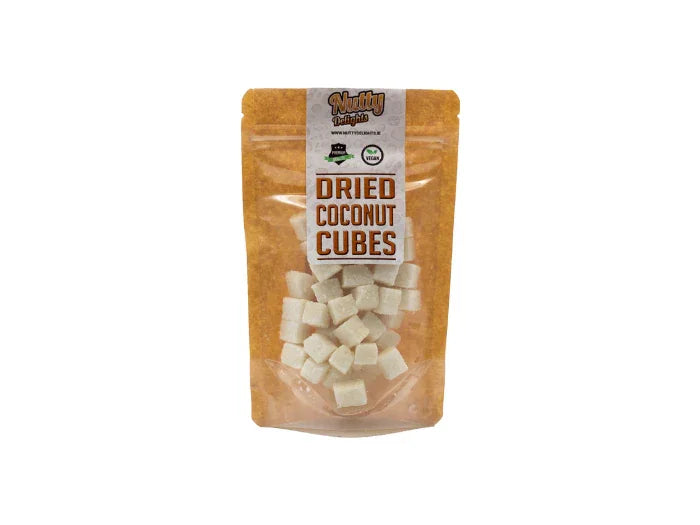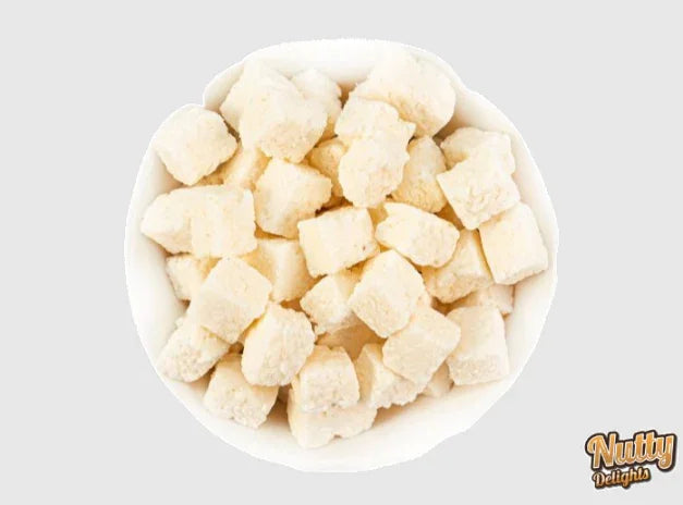 Chopped coconut cubes are chewy, delectable and taste amazing! They are a great topping to yogurt or cakes.