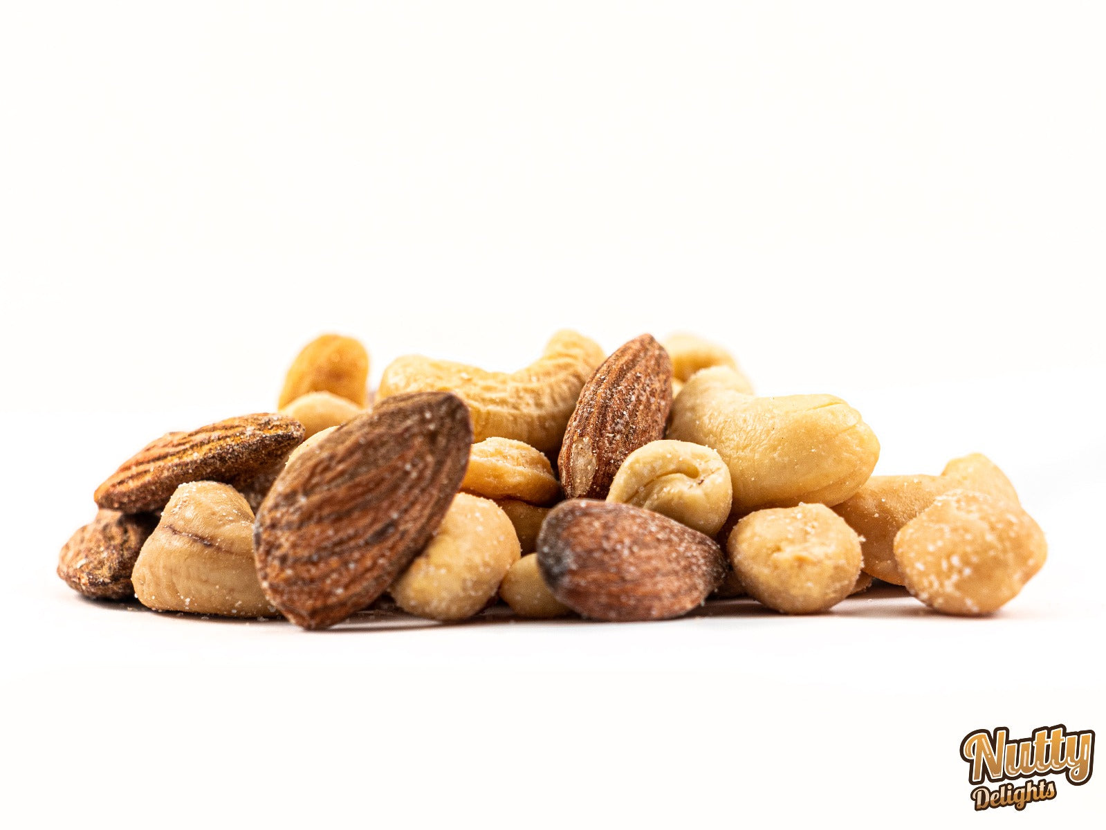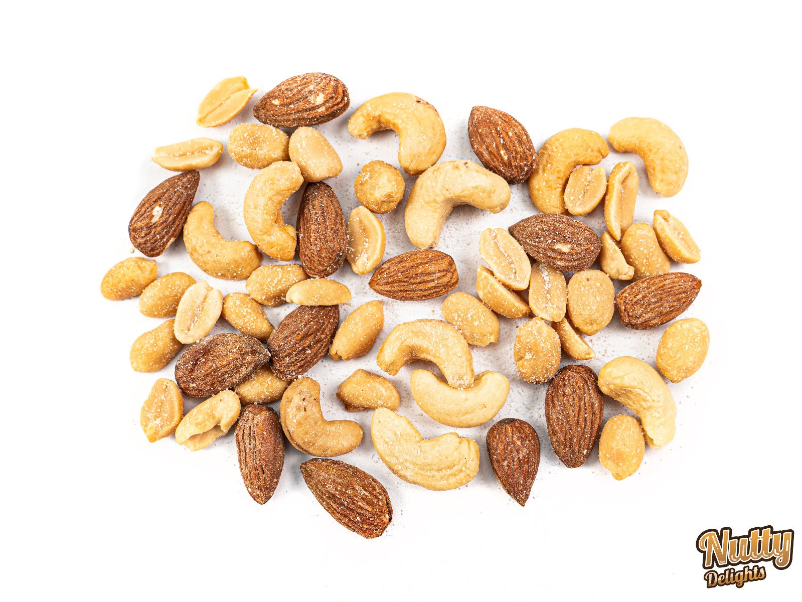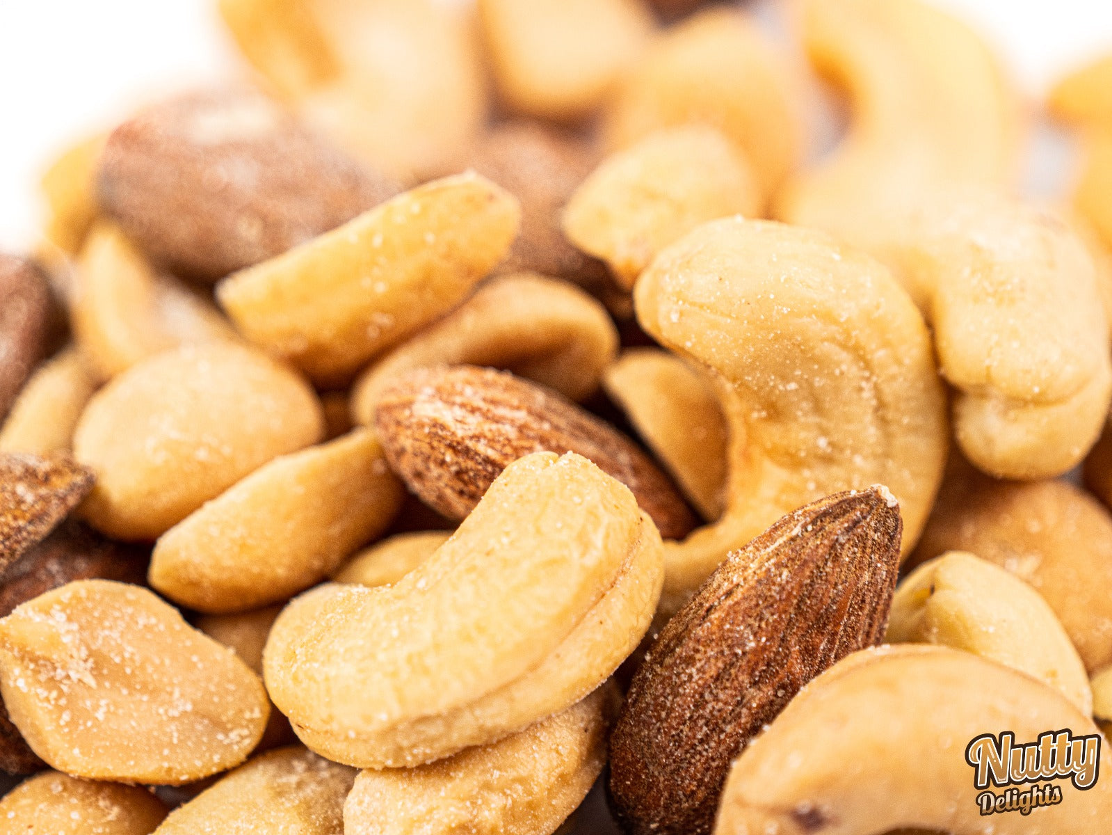 Roasted & Salted PEANUTS (PEANUTS, rapseed oil, salt) Roasted & Salted ALMONDS (ALMOND, rapseed oil, salt), Roasted & Salted CASHEWS (CASHEW, rapseed oil, salt).