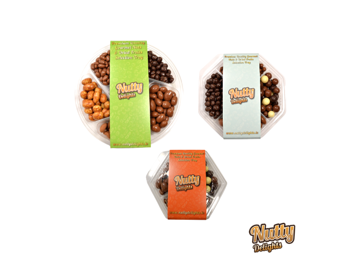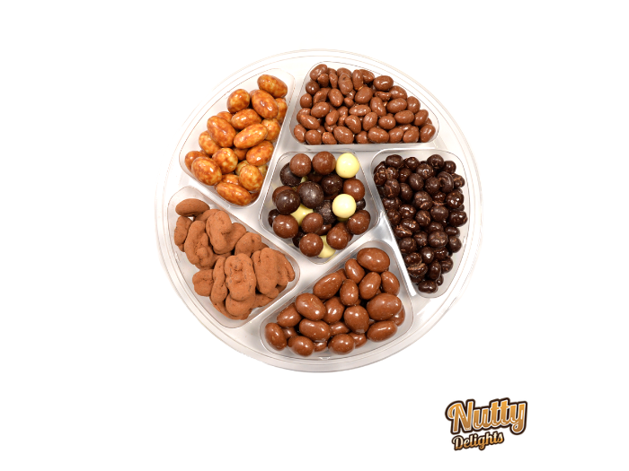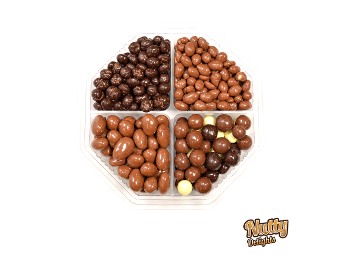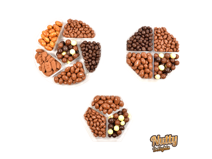 These trays come in various variations of nuts and chocolate, dark, milk, and white chocolate with different type of nuts like almonds, hazelnuts, peanuts, and more. They make a perfect gift for any occasion and a great way to showcase a delicious variety of nuts.