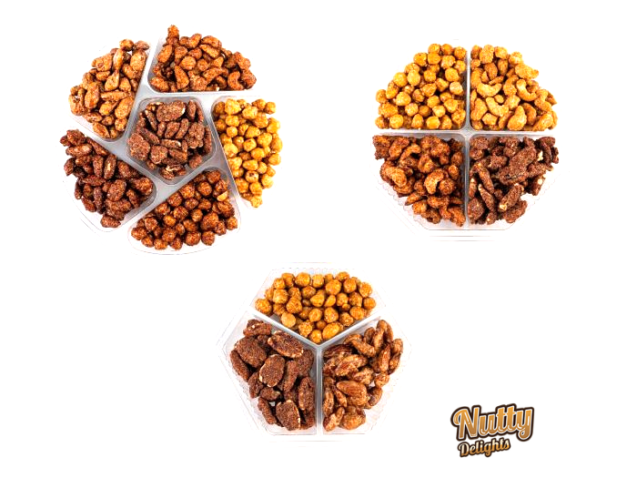 Honey Almonds, Honey Cinnamon Cashews, Honey Hazelnuts, Honey Cinnamon Hazelnuts, Honey Cinnamon Almonds, Honey Pecans.