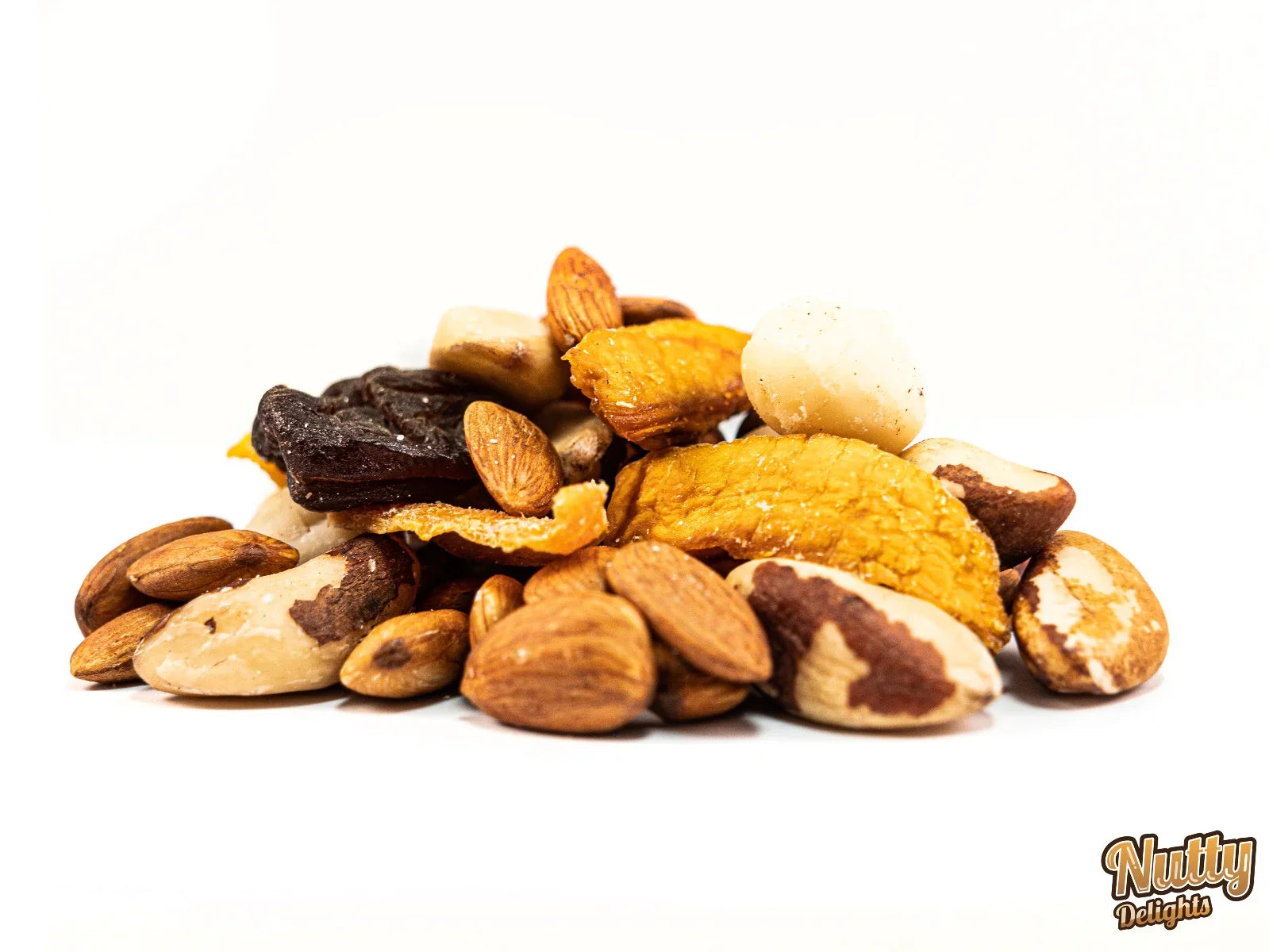 Whole ALMONDS, whole BRAZIL NUTS, MACADAMIA NUTS, mango (mango, S02), unsulphured apricots.