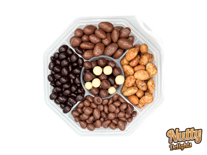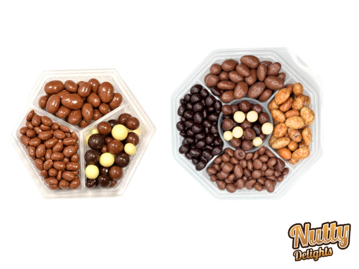 These trays come in various variations of nuts and chocolate, dark, milk, and white chocolate with different type of nuts like almonds, hazelnuts, peanuts, and more. They make a perfect gift for any occasion and a great way to showcase a delicious variety of nuts.